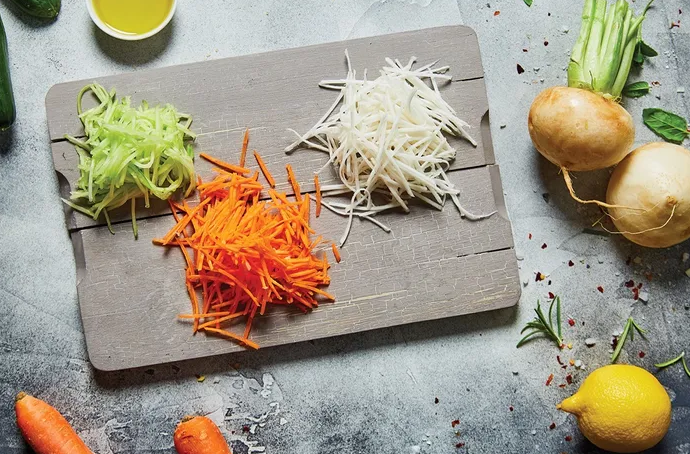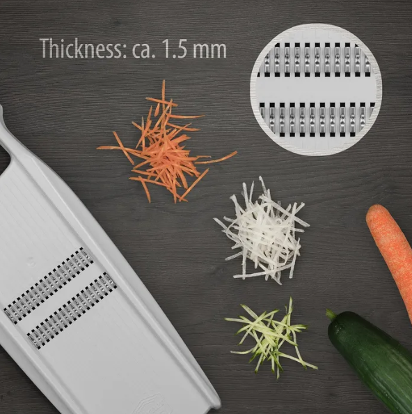 With the original Borner Roko Grater you can cut fruit and vegetables into fine thin julienne strips. The julienne slicer cuts root vegetables such as carrots, celery, parsnips or kohlrabi, but also potatoes or cucumbers can be grated and processed into fine julienne strips.