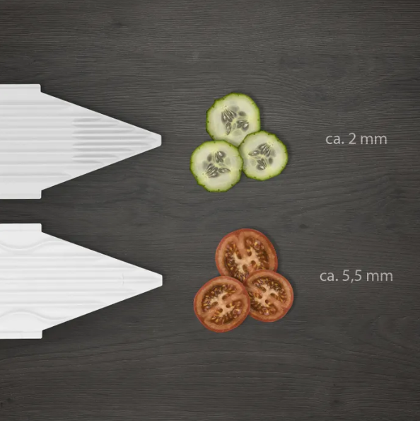 For safe handling, the V3 fruit and vegetable slicer has integrated rubber feet that guarantee a firm footing while the ergonomically shaped handle makes it easier to handle the vegetable slicer.