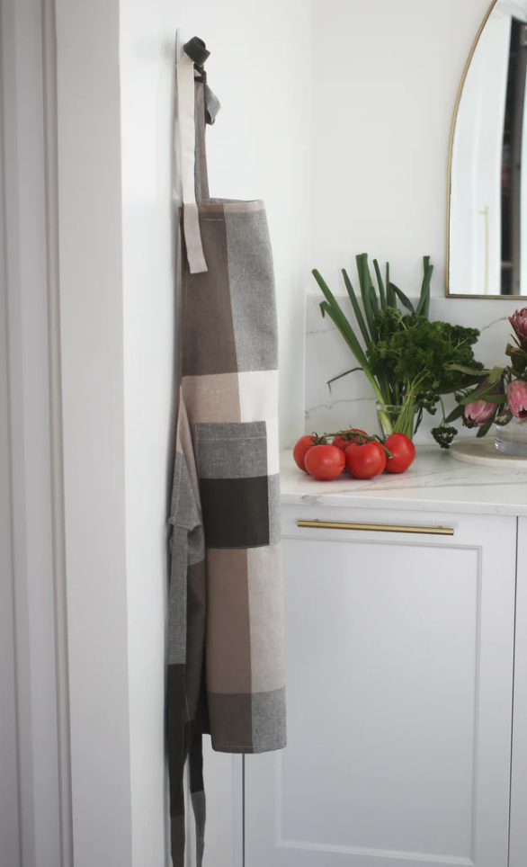 Standard tie apron in giant check black, taupe & 1/2 white. Complete with pocket for all the kitchen essentials.