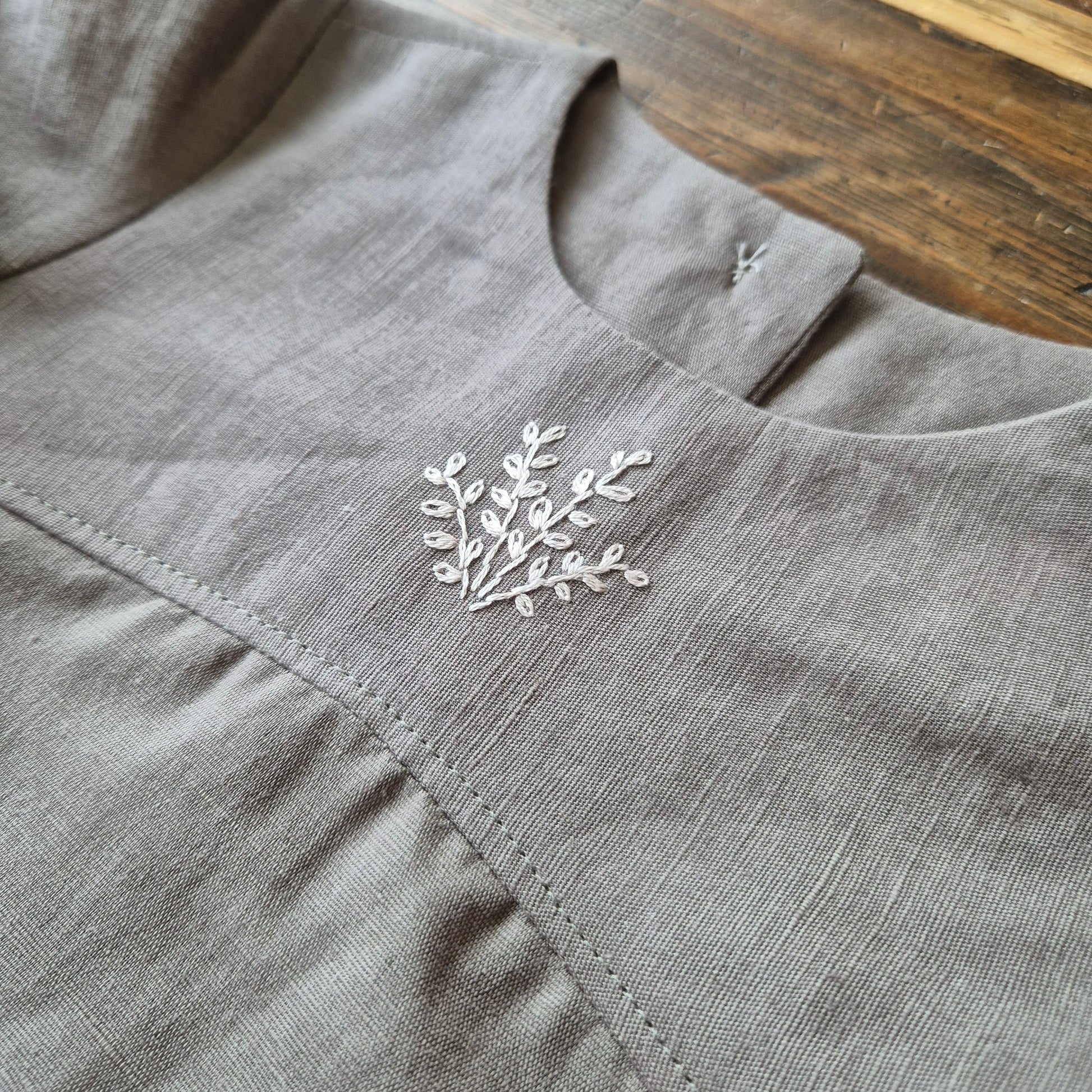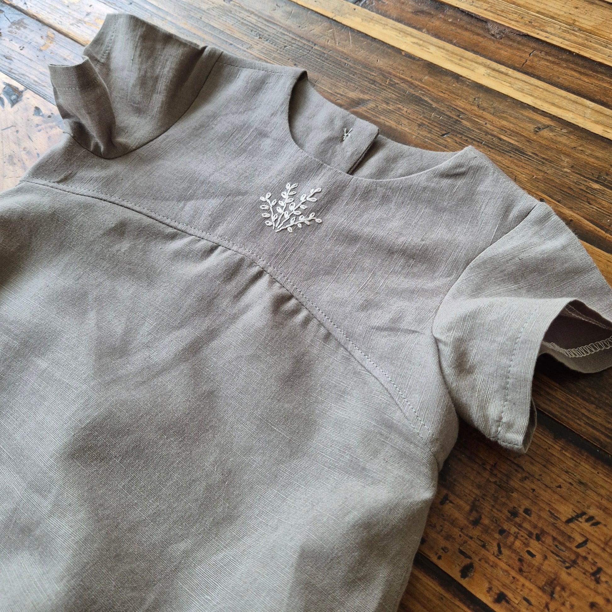 Beautiful linen romper with curved seam detail and embroidered bodice.